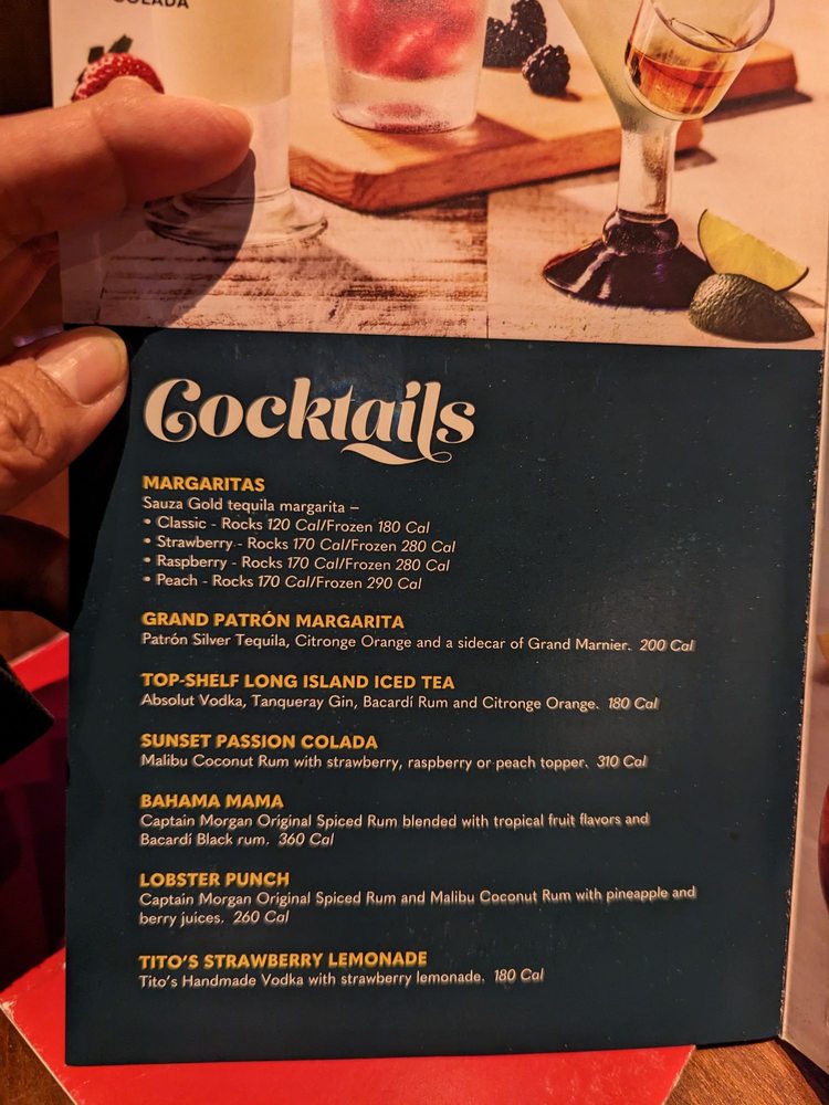 Made with Sauza Gold tequila. Rocks (200 cal) / Frozen (330 cal). Classic, Strawberry, Raspberry, Watermelon, Caribbean Blue, Passion Fruit, Mango